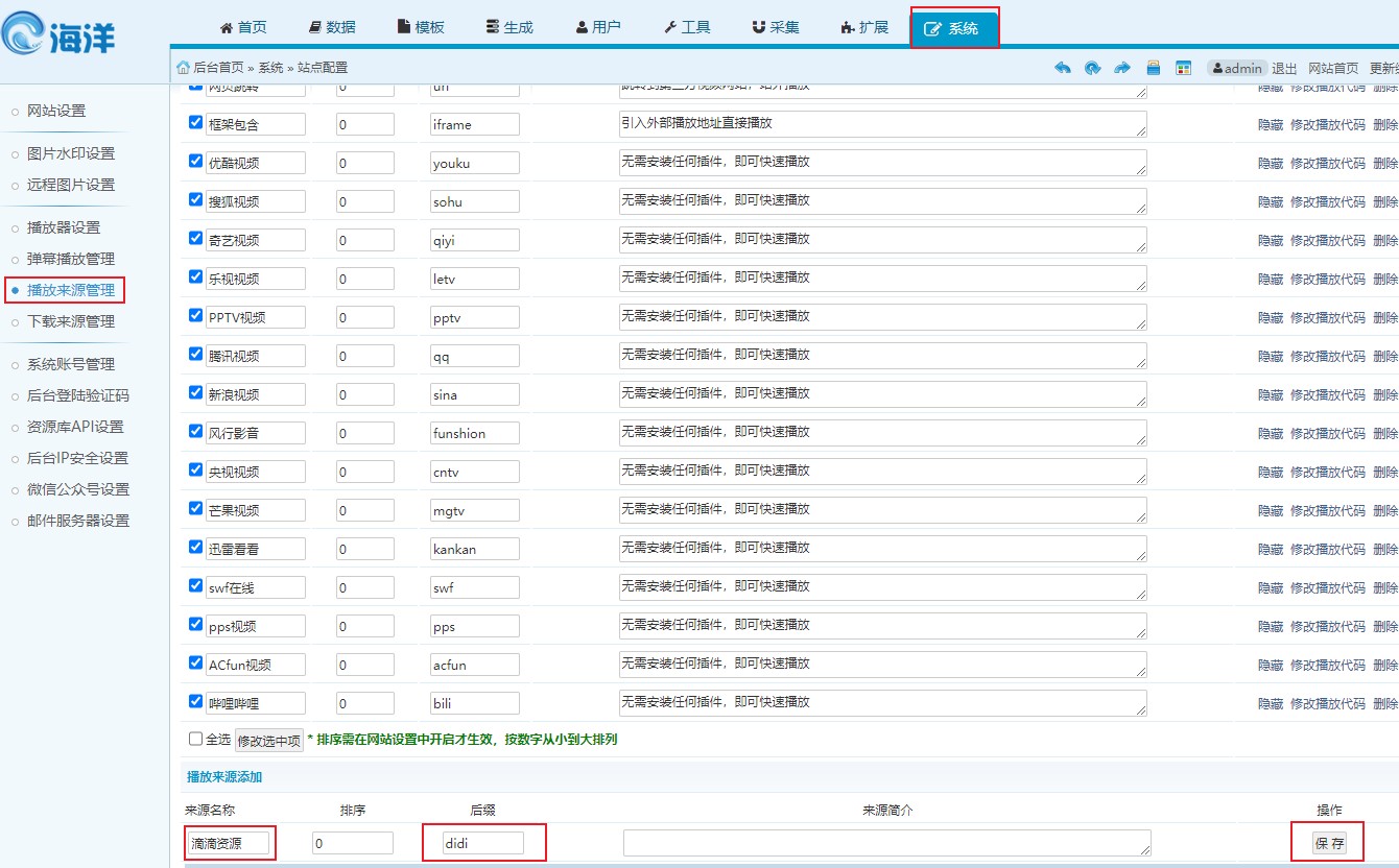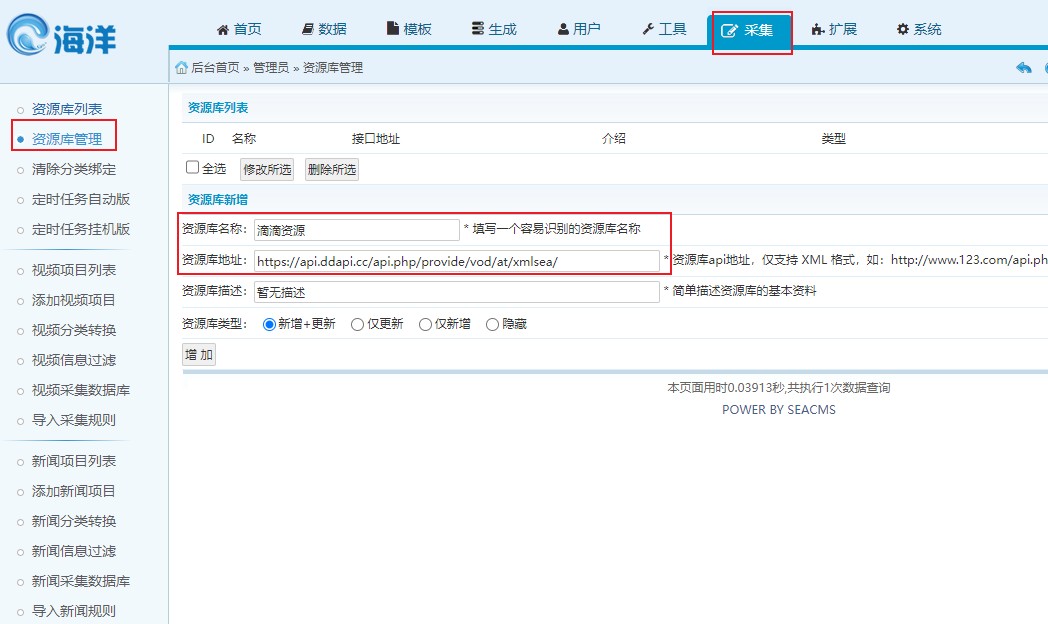 第二步:添加采集接口:https://api.ddapi.cc/api.php/provide/vod/at/xmlsea/